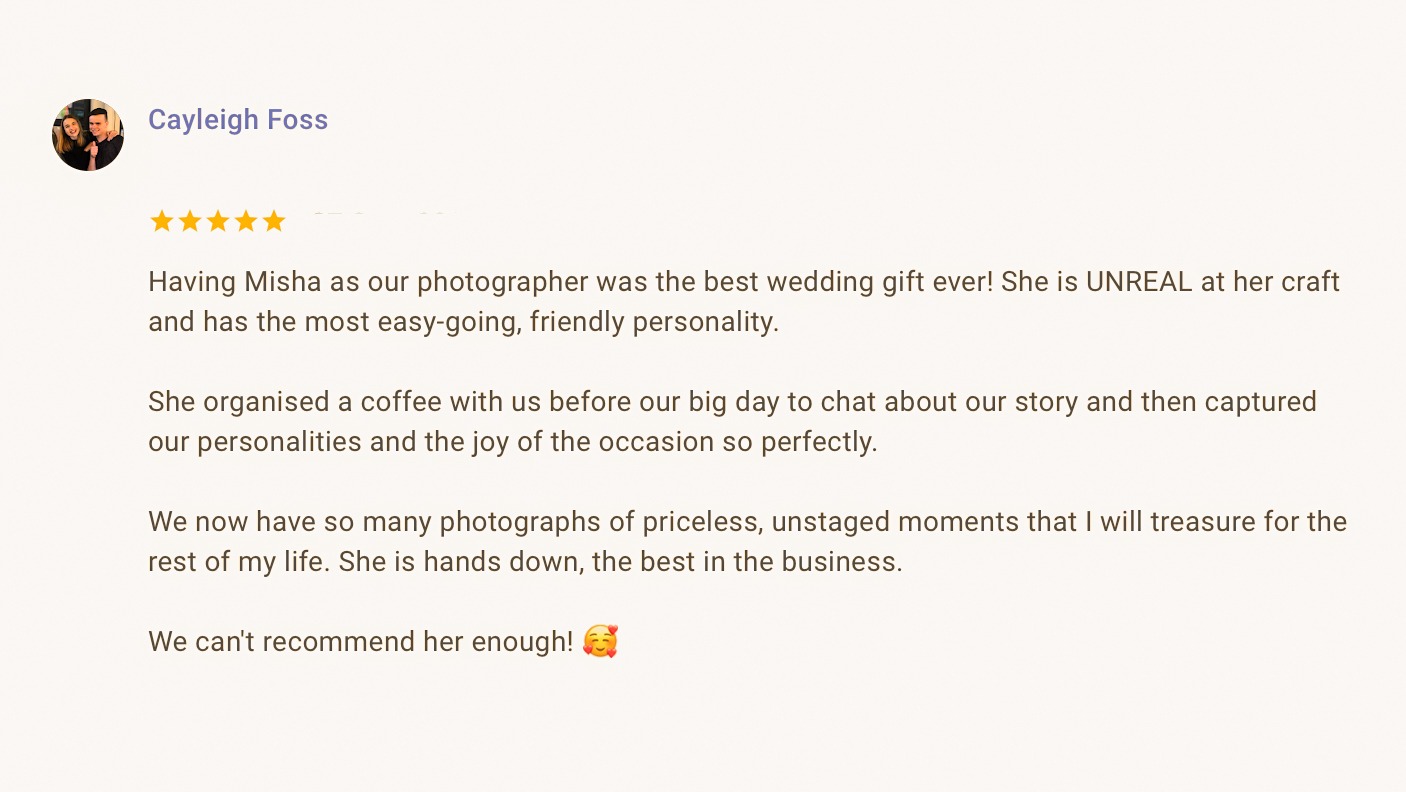 Your love story is in safe hands. When you book me, it comes along with a decade worth of experience. And rightly so, all those years has made me a bit of a wedding nerd. All my clients recieve timeline guides, detailed recommendations and a bounty of actually-helpful-wedding-advice. And of course, I always come prepared with an arsenal of photo prompts for all that candid magic we love.